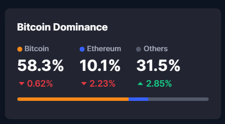 Según los datos suministrados por CoinMarketCap se puede evidenciar cómo a pesar que el retroceso de BTC es de apenas el 0,62% existe un número negativo en la dominancia de Bitcoin que ahora es de 58,3% frente a 31,5% de otras criptomonedas que registran un 2,85% de recuperación frente a la criptomoneda madre.