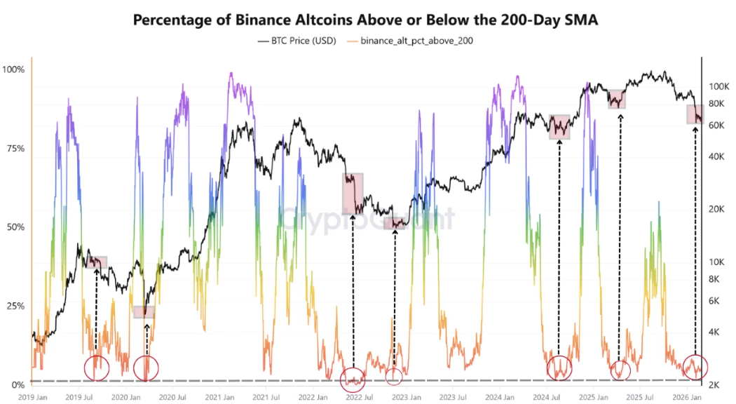 Uno de los indicadores más reveladores y, a menudo, menos valorados es la amplitud técnica basada en la Media Móvil Simple de 200 días (200DMA). Actualmente, el 95% de las altcoins listadas en Binance cotizan por debajo de esta línea de tendencia a largo plazo. En términos estadísticos, solo un 5,29% de los activos mantienen una estructura técnica saludable.