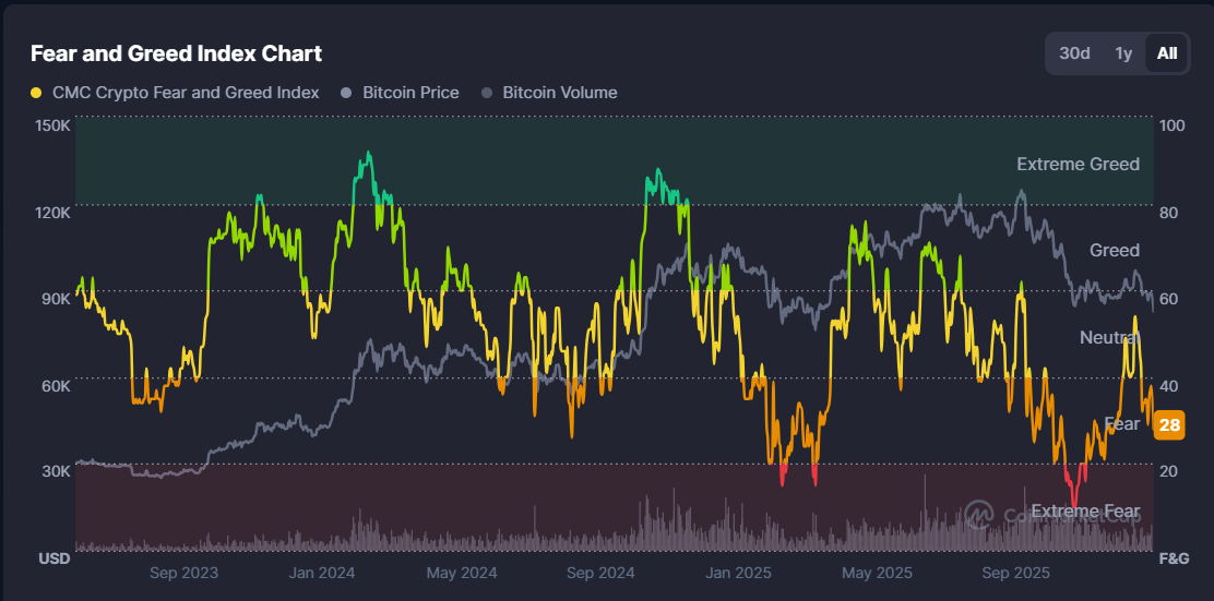 A corto plazo, el mercado adopta una postura conservadora con un Índice de Miedo y Codicia situado en 28 puntos,según lo datos registrados por CoinMarketCap lo que denota un sentimiento de temor entre los inversores.