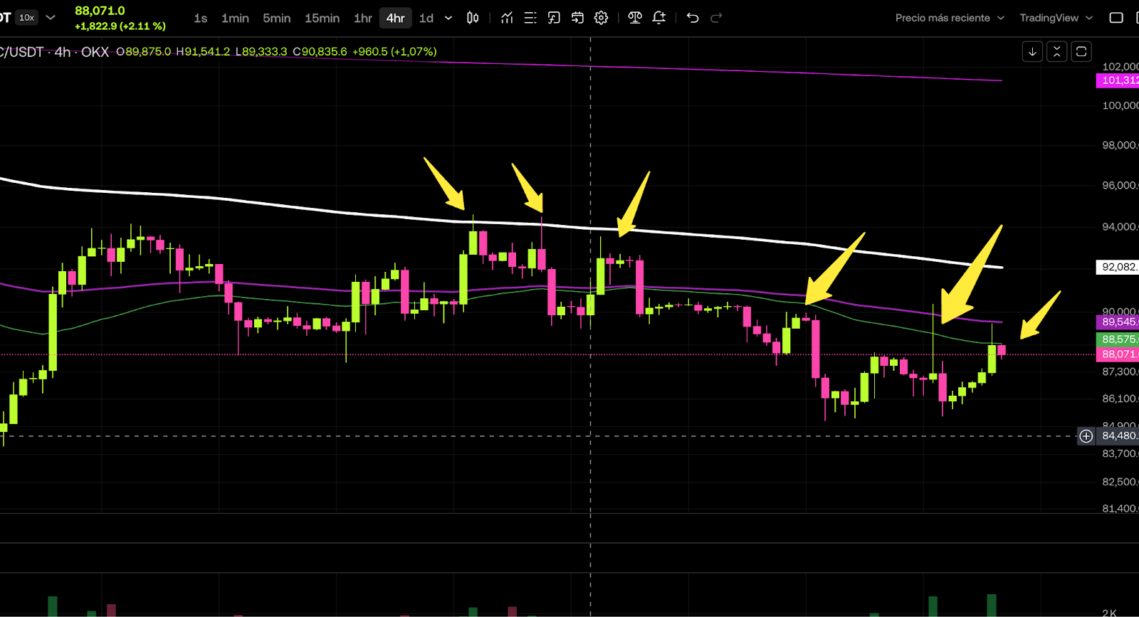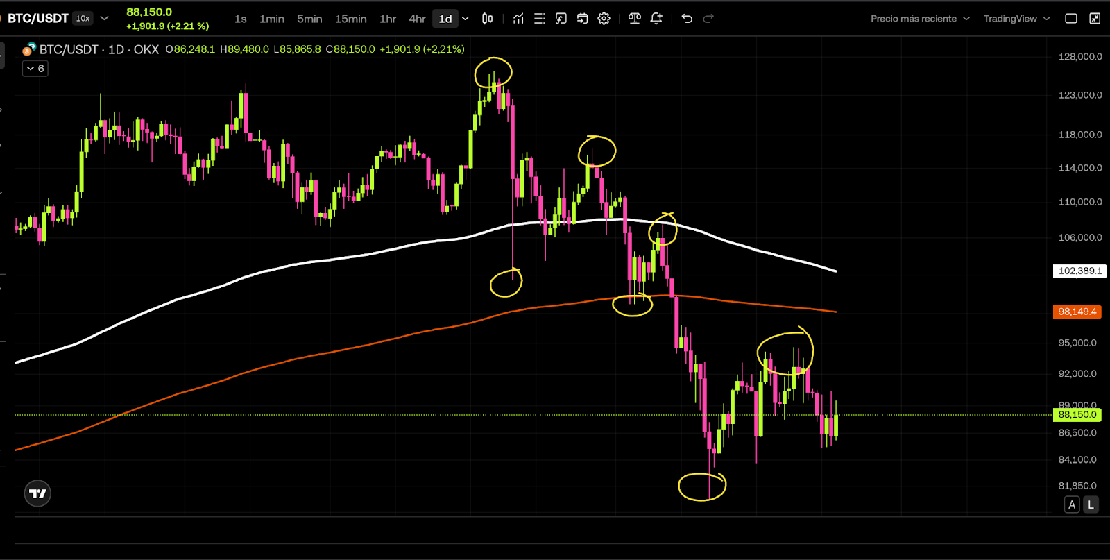 El analista, en entrevista exclusiva con el equipo de LatamBlocks, sostuvo que la estructura actual es “muy bajista” y observa que cada intento de recuperación del precio está siendo “rápidamente absorbido por ventas muy grandes”, lo que sugiere una participación activa de manos institucionales en la distribución del activo, según explicó Calderón.