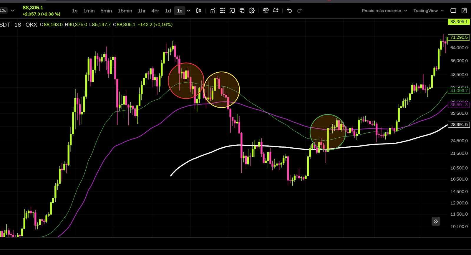 Asimismo, el experto subrayó la pérdida de la media móvil exponencial (EMA, por sus siglas en inglés) de 50 periodos en el gráfico semanal, un indicador que históricamente ha definido la continuidad de los ciclos alcistas. “La EMA de 50 semanas (En verde) ha marcado históricamente la continuación de un mercado alcista y la finalización del mismo. Solo durante 2024/25, esta EMA fue el apoyo principal de la tendencia al alza. Cada vez que el precio tenía testeos a esta EMA, Salía disparado en el próximo impulso alcista (Circulos amarillos). Actualmente, este promedio móvil fue roto fuertemente por el precio (Circulo Rojo)”.