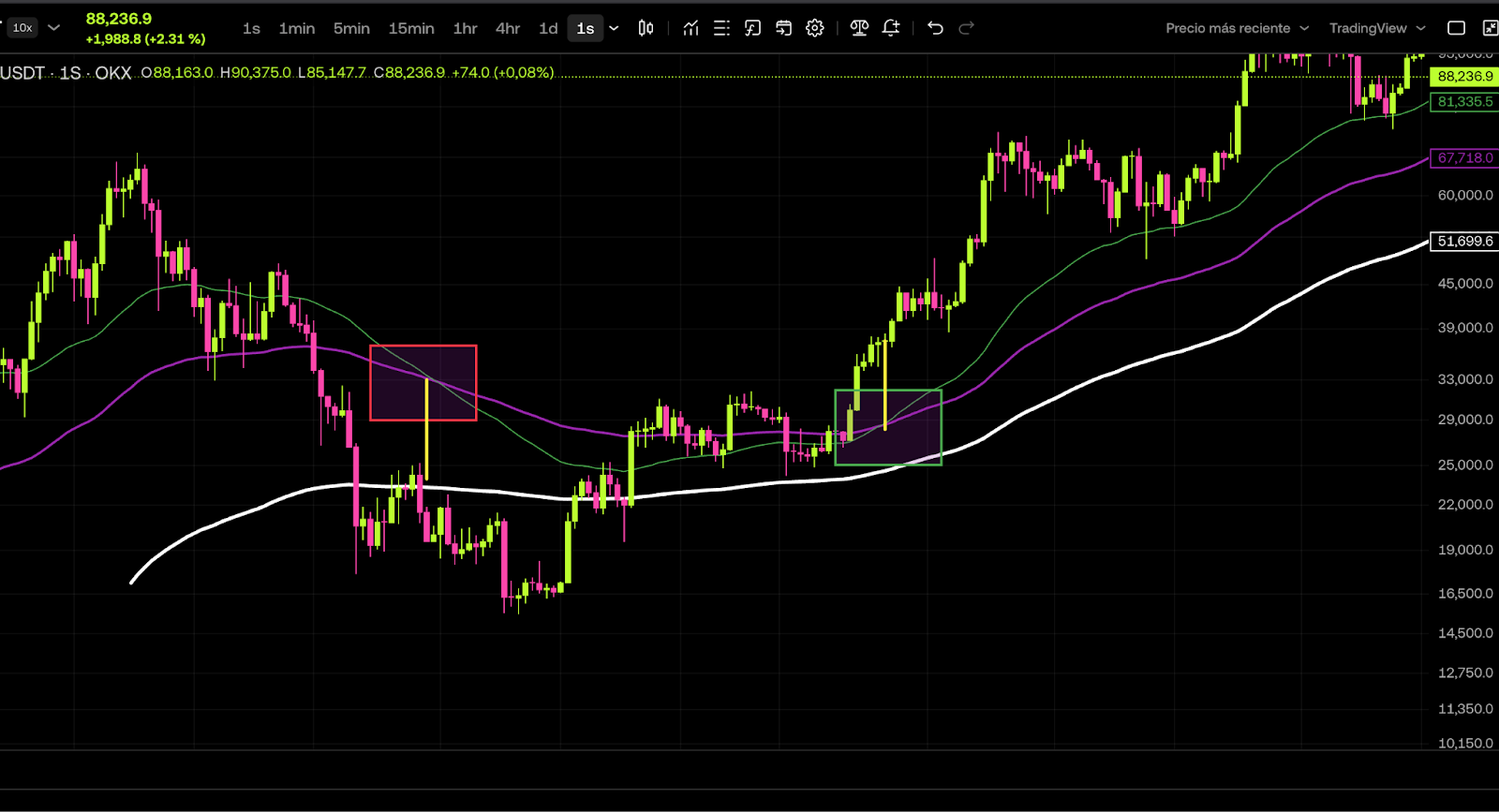 Sobre este punto, Calderón advirtió que “la última vez que esto sucedió fue en el 2022 y la misma EMA sirvió como resistencia durante más de un año para darle continuidad al mercado bajista”.