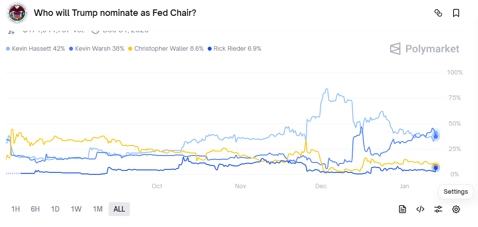 Y es que los mercados de predicción ofrecen una ventana a las expectativas de los inversionistas. En plataformas como Polymarket, los operadores asignan solo un 8% de probabilidades a que Powell sea destituido antes del 31 de marzo, lo que indica un escepticismo generalizado sobre una salida forzada inmediata. No obstante, la atención ya se desplaza hacia quién podría ocupar la silla de la Fed, con los ojos puestos en Kevin Hassett y Kevin Warsh. Hasset ya ha sido seleccionado por algunos bitcoiners, como el youtube Lark Adam Davis, como la mejor opción para bitcoin.