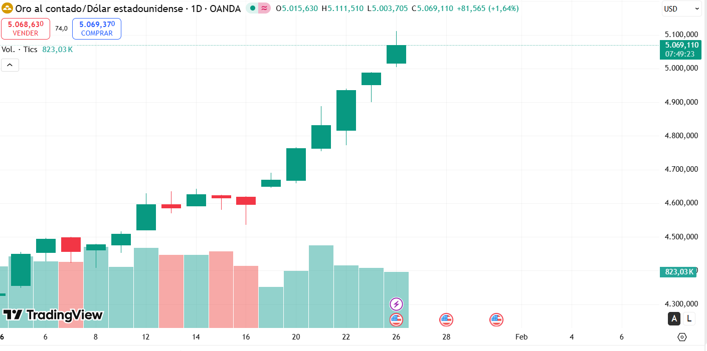 Mientras el precio de bitcoin retrocede, el oro alcanzó máximos históricos por encima de los USD 5.000 por onza, según los datos registrados en TradingView, al momento de la redacción de este artículo. Estos podría indicar que los inversores están rotando capital hacia refugios seguros tradicionales ante las crecientes tensiones comerciales globales y la amenaza de aranceles por parte de la administración estadounidense. En este escenario de incertidumbre, bitcoin está siendo tratado más como un activo de riesgo que como una reserva de valor digital.