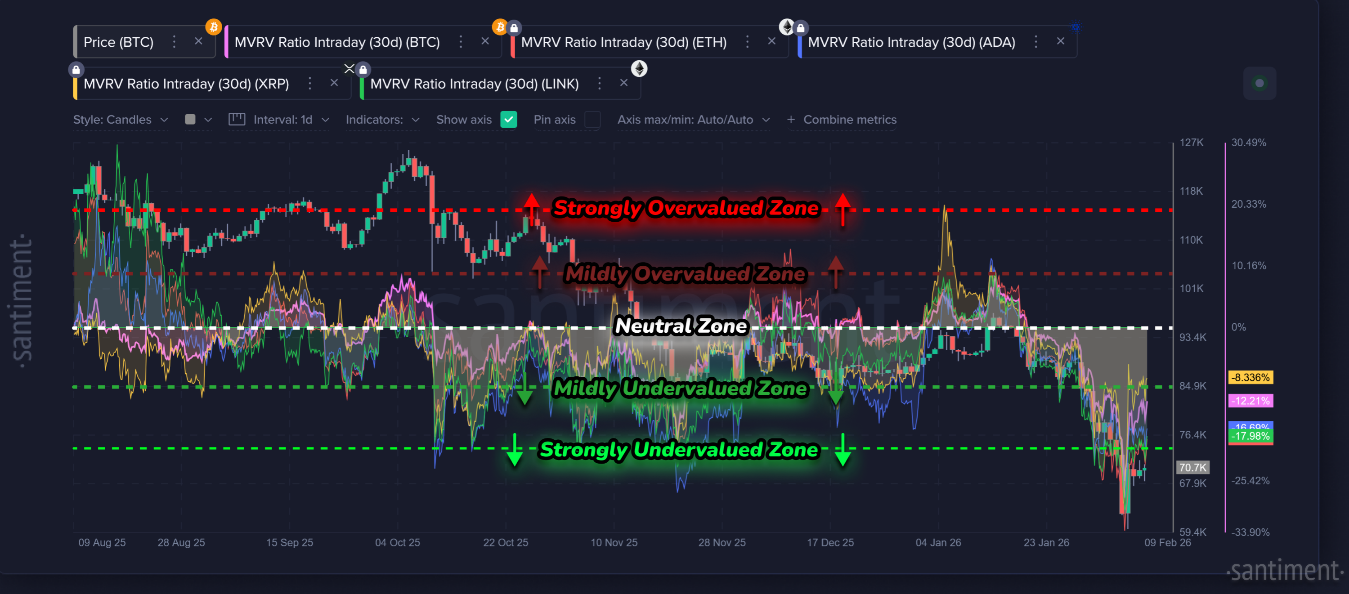 Más allá del sentimiento en redes sociales, Santiment destaca la importancia de mirar dentro de la cadena de bloques para obtener una perspectiva matemática. Aquí es donde entra en juego el ratio MVRV (valor de mercado frente al valor realizado), una métrica que permite visualizar cuándo los operadores están lo suficientemente "bajo el agua" como para que el precio rebote de forma fiable.