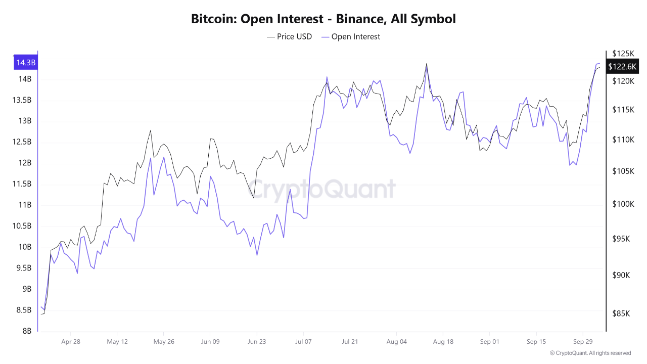 “Desde finales de septiembre, el precio de Bitcoin experimentó un sólido repunte de USD 108K a USD 122K. Durante este período, el interés abierto subió de USD 11.500 millones a USD 14.369 millones, lo que representa un aumento significativo en un tiempo récord”, detalló la reseña de CryptoQuant.