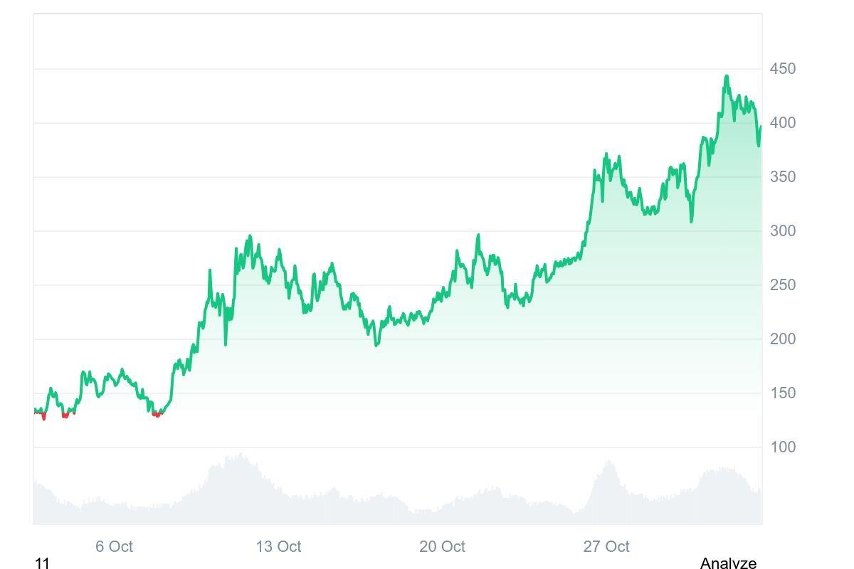 Zcash celebró su noveno aniversario el 28 de octubre con un avance significativo. El precio pasó de 55 dólares a inicios del mes a 414 dólares al cierre, lo que representa un incremento superior al 200% en este período. Y es que solo en la última semana, registró ganancias del 19%.