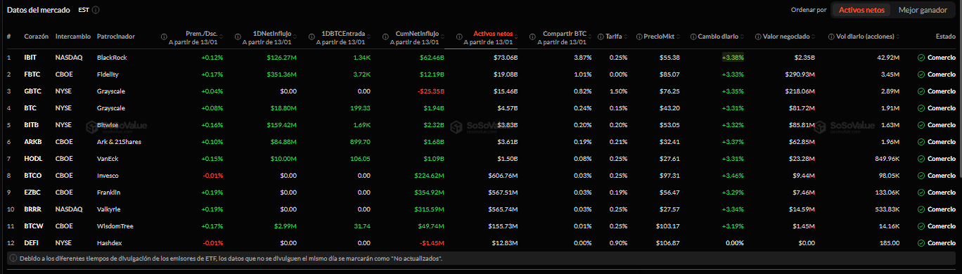 El flujo de capital se distribuyó entre los principales vehículos de inversión. El ETF con mayor ingreso de flujo fue el de Fidelity, que capturó aproximadamente $351 millones de dólares. Le siguió el ETF de Bitwise, con un monto cercano a los $159 millones, y en tercer lugar el IBIT de BlackRock, con entradas estimadas en $126 millones.
