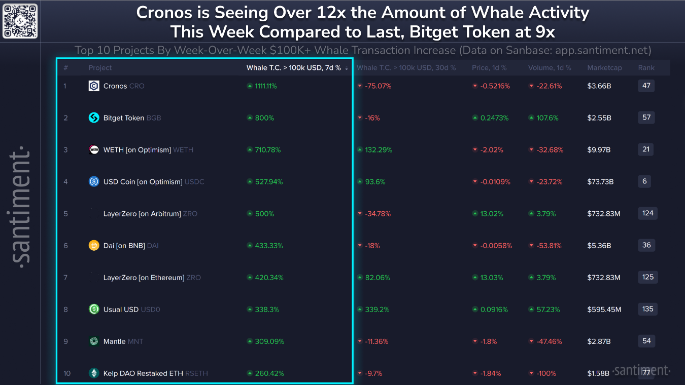 La tendencia más agresiva se concentra en los tokens nativos de los intercambios centralizados. Cronos ($CRO), el activo de la red vinculada a Crypto.com, lidera la lista con un incremento asombroso del 1.111% en la actividad de ballenas. Le sigue de cerca el Bitget Token ($BGB), del exchange Bitget, con un aumento del 800%.
