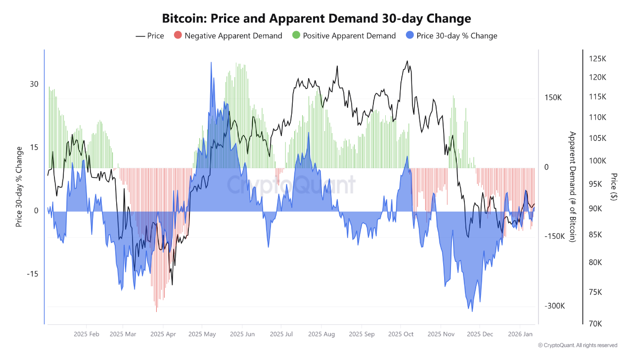 La dinámica actual del mercado de Bitcoin sugiere que el activo está ingresando en una fase de enfriamiento necesaria tras un periodo de intensa volatilidad y actividad especulativa. La métrica de demanda aparente a 30 días ha tornado a terreno ligeramente negativo, un movimiento que, según los analistas, no debe interpretarse como una debilidad estructural o el inicio de una tendencia bajista clara.