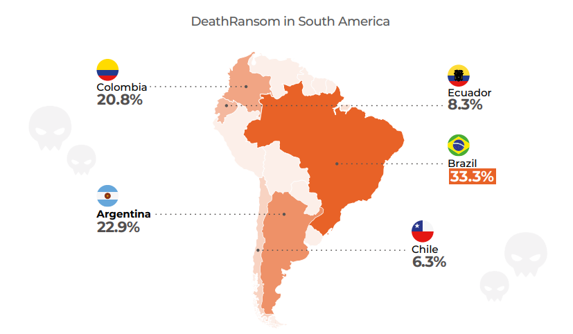 La táctica del secuestro de datos también ha evolucionado. DeathRansom domina el mercado regional (53,3%) con un modelo de negocio que prioriza la extorsión pura, evitando a menudo la compleja encriptación de archivos para centrarse directamente en la amenaza de filtrar información sensible.