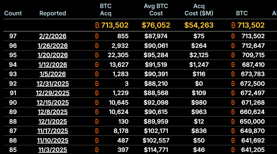 MicroStrategy ha adoptado durante años una estrategia mantener la inversión a largo plazo sin importar la volatilidad del precio de (HODL). Según los datos publicados en el sitio web de la compañía, actualmente, la firma posee un total de 713.502 BTC, adquiridos a un precio promedio de USD 76.052 por unidad. Para consolidar esta posición, la empresa ha invertido un capital total de 54.263 millones de dólares.