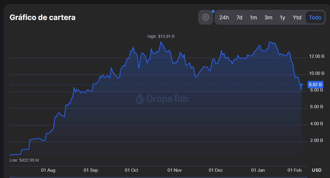 Por otro lado, la estrategia de Bitmine, centrada en el ecosistema de Ethereum, presenta un escenario de mayor presión. Al comparar el máximo histórico (ATH, por sus siglas en inglés), registrado el 16 de julio de 455,90 USD, frente al precio actual de 127,92 USD, se observa un retroceso crítico. Esta caída representa una pérdida del 60% en el valor de su portafolio en relación con sus niveles máximos, según los datos registrados en el portal web oficial de Dropstab.