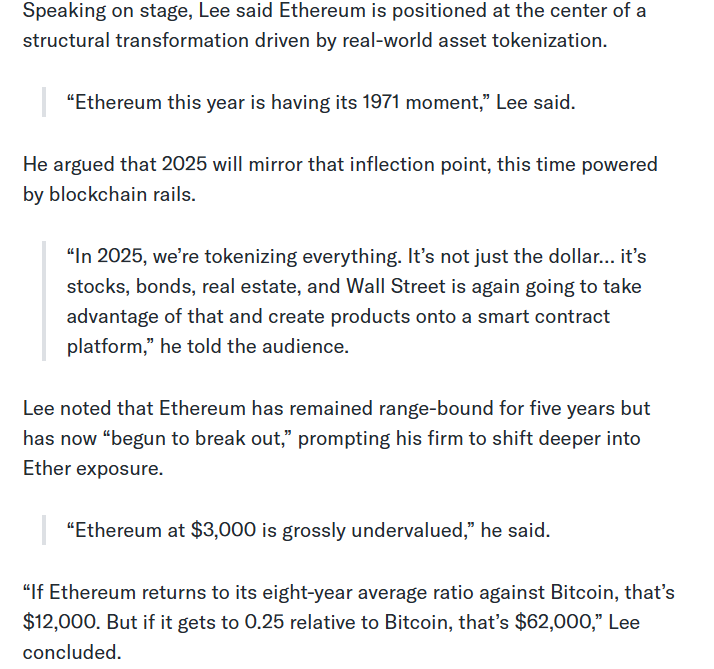 La controversia se intensifica al recordar que el analista había pronosticado anteriormente que Ethereum alcanzaría los USD 15.000 para finales de 2025. No obstante, sus declaraciones más recientes en el escenario insisten en que el ecosistema está atravesando una transformación estructural impulsada por la tokenización de activos del mundo real. En dicho evento, Lee señaló que “Ethereum está viviendo este año su momento 1971” y argumentó que el 2025 refleja un punto de inflexión apoyado en la infraestructura blockchain.