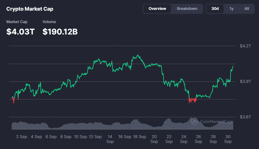 El esperado mes de Uptober no defraudó a los cripto entusiastas. Desde la noche del pasado 30 de septiembre los números de la capitalización de mercado cripto comenzaron su carrera por la recuperación, después de haber estado en números rojos desde el pasado 25 de septiembre. Al momento de la redacción de este artículo el mercado registró una capitalización de mercado de USD 4.03 trillones de dólares correspondiente al 4,37% de aumento, según los datos publicados por CoinMarketCap.