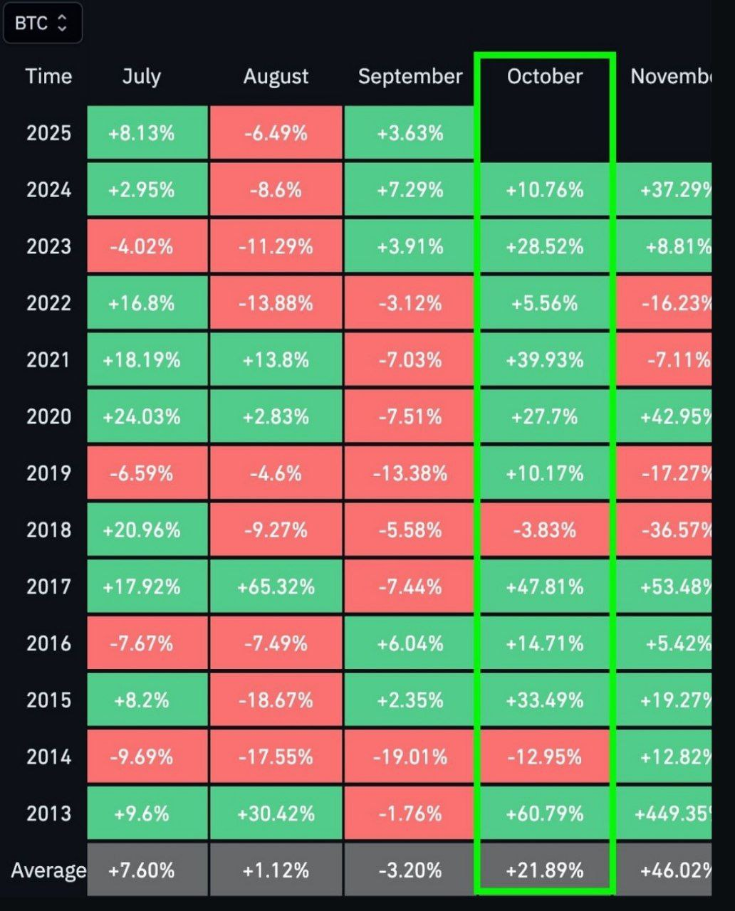 La expectativa de los entusiastas era de esperarse, la tendencia histórica es que durante este mes de octubre el mercado de las criptomonedas, especialmente Bitcoin, ha mostrado un aumento de precios significativo. Y la muestra es que desde el año 2013, hasta la actualidad, Bitcoin solo ha estado en pérdida en dos oportunidades; una fue en el mes de otubre del año 2014 y luego en el mes de agosto del año 2018.