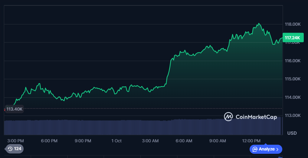 La escalada del precio de Bitcoin inició después de 1:00 pm de este pasado 30 de septiembre, donde el precio salió de la barrera de los USD 109.000 - USD 116.000 en la que había estado desde el inició del mes de septiembre, según datos de CoinMarketCap. En las últimas 24 horas el precio de Bitcoin subió un 3,16% logrando alcanzar un precio superior a los USD 117.000 al momento de la redacción de este artículo.