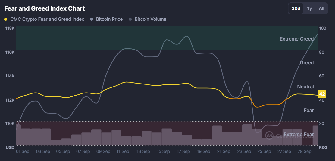 A pesar de que el mercado empezó el mes de octubre con señales positivas, el “Crypto Fear and Greed Index”, en español "Índice de Miedo y Codicia", de la plataforma CoinMarketCap. Se registró que el indicador se encuentra en una posición neutral marcando los 42 puntos, al momento de la redacción de este artículo. Ciertamente esto pudiera considerarse como positivo, luego de que el sentimiento registrara durante la semana y el mes pasado sentimiento de miedo en el mercado.