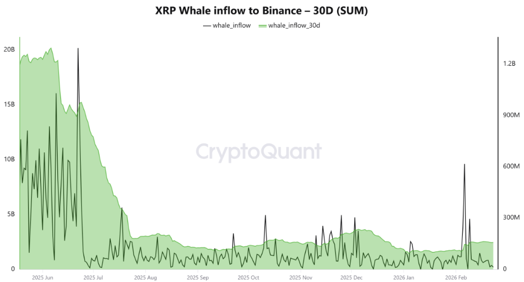 La señal bajista más contundente proviene de la actividad de las carteras de gran tamaño, conocidas como "ballenas". Los datos recientes de flujo hacia Binance muestran un cambio drástico: el promedio mensual de entradas ha escalado hasta los 2.540 millones de XRP. Este volumen no representa un evento aislado de un día, sino una acumulación gradual que refleja el retorno de los grandes inversionistas tras un periodo de inactividad.